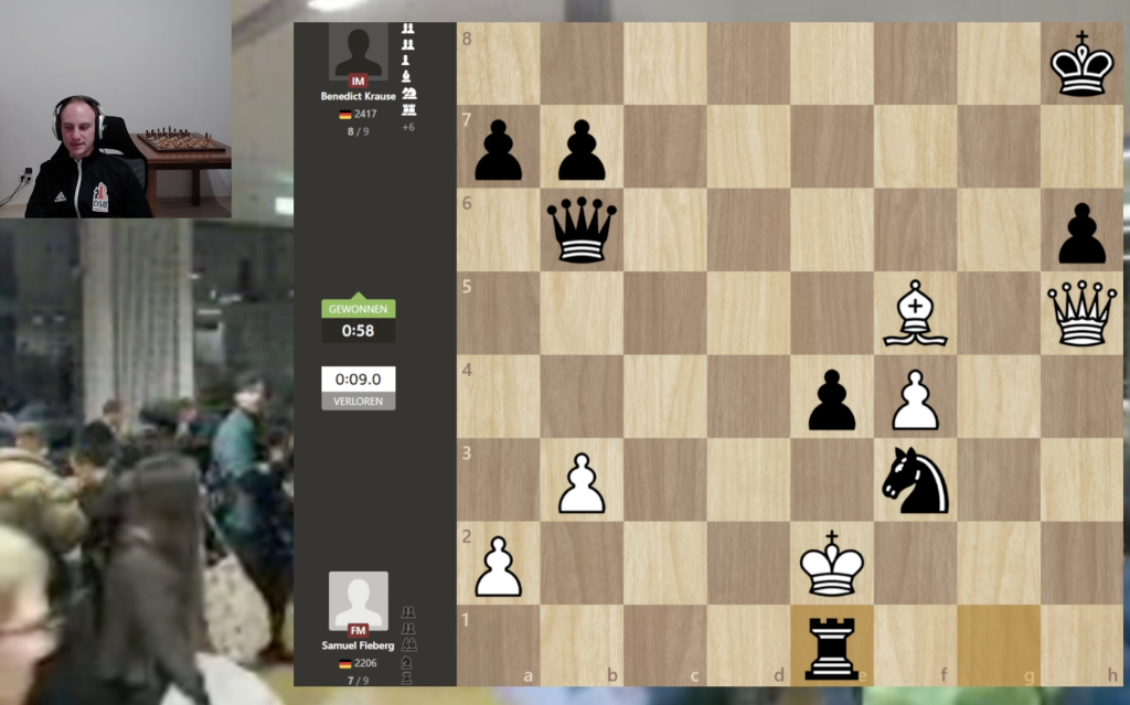 Unser Bundesliga-Kapitän Benedict Krause, der gerade seine Masterarbeit an der Uni Kiel abgegeben hat, ging als einer der Favoriten ins Turnier – und konnte diese Rolle im Schnellschach mit einer krassen Performance von 8 aus 9 bestätigen (im Bild oben die Schlußstellung aus der letzten Runde). Wir haben nun also nicht nur den aktuellen französischen und den aktuellen dänischen Meister im Bundesliga Kader – sondern auch einen deutschen.